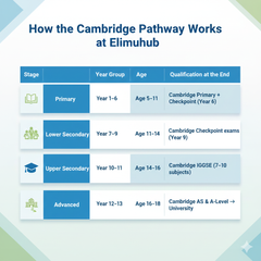| A visual guide to the Cambridge education pathway at Elimuhub, outlining each learning stage from Primary through IGCSE to A Level and the qualifications students earn along the way. |